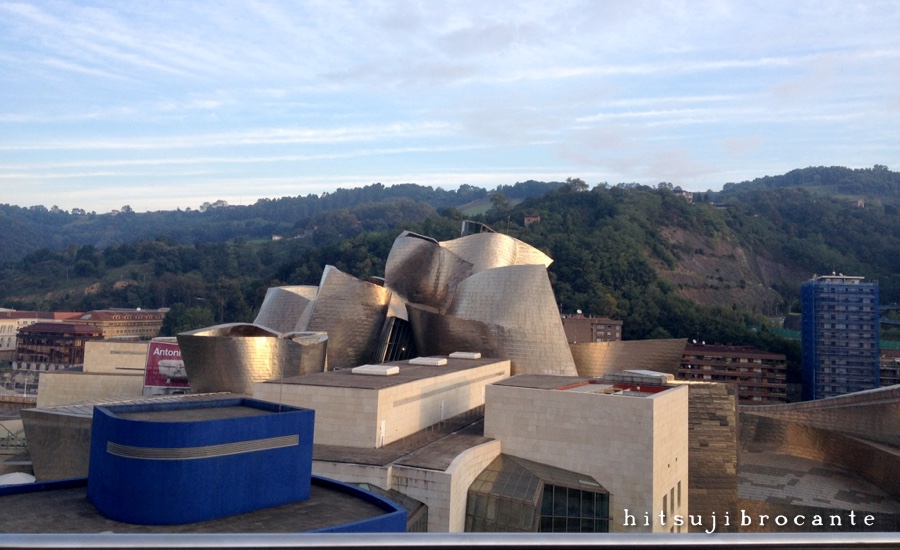 翌日の朝。ホテルの屋上テラスからのグッゲンハイム。朝日が屋根に反射してぴかぴかに輝いています。