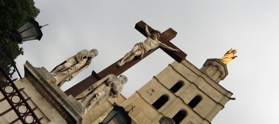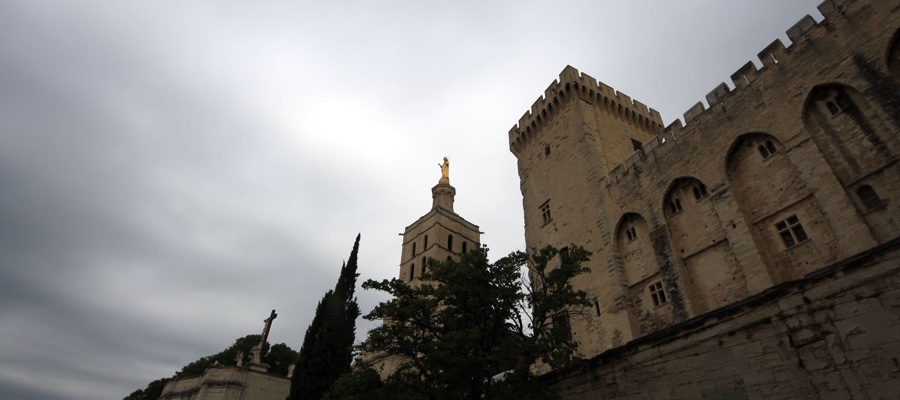 歴史を感じさせる旧市街でひときわ目立つのは、教皇庁。頂上にあるマリア像が市街を見下ろしています。(写真を撮った日は残念ながら曇り空でした。)